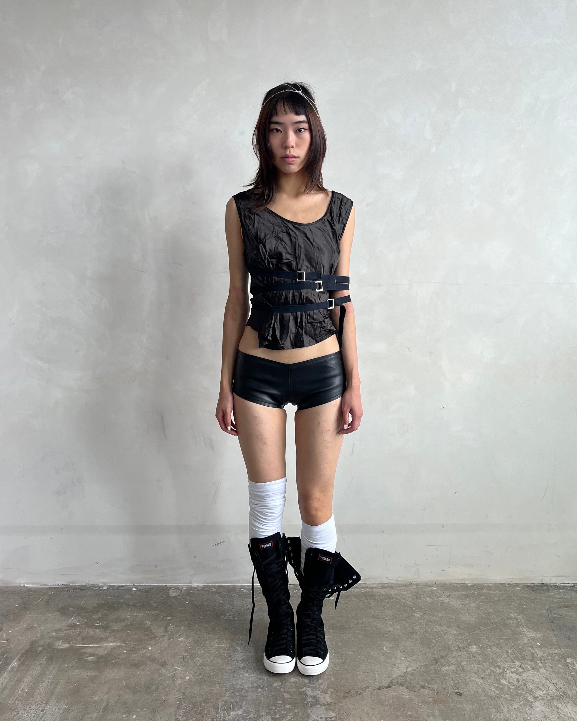 Dark green crinkle tank top with bondage straps. So many ways to style the straps.