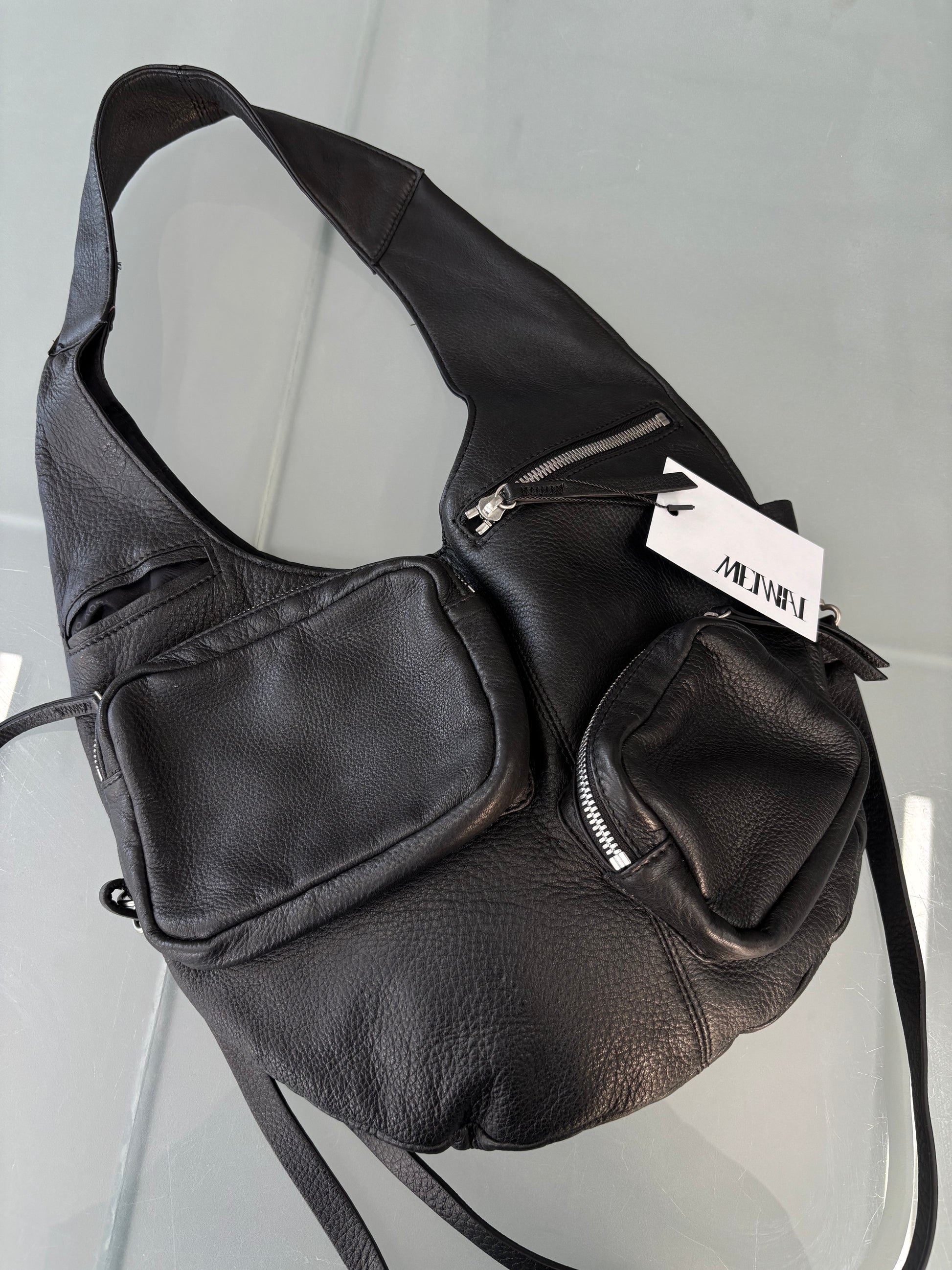 Beautiful curved shape real leather bag with multi-pockets.