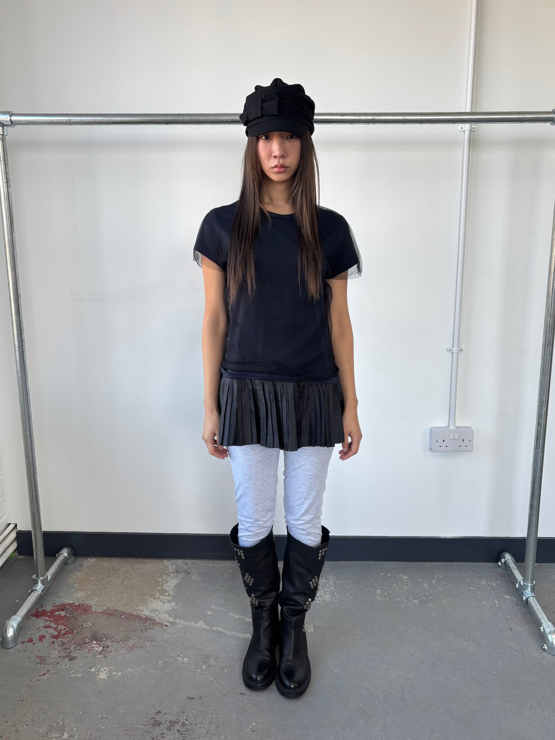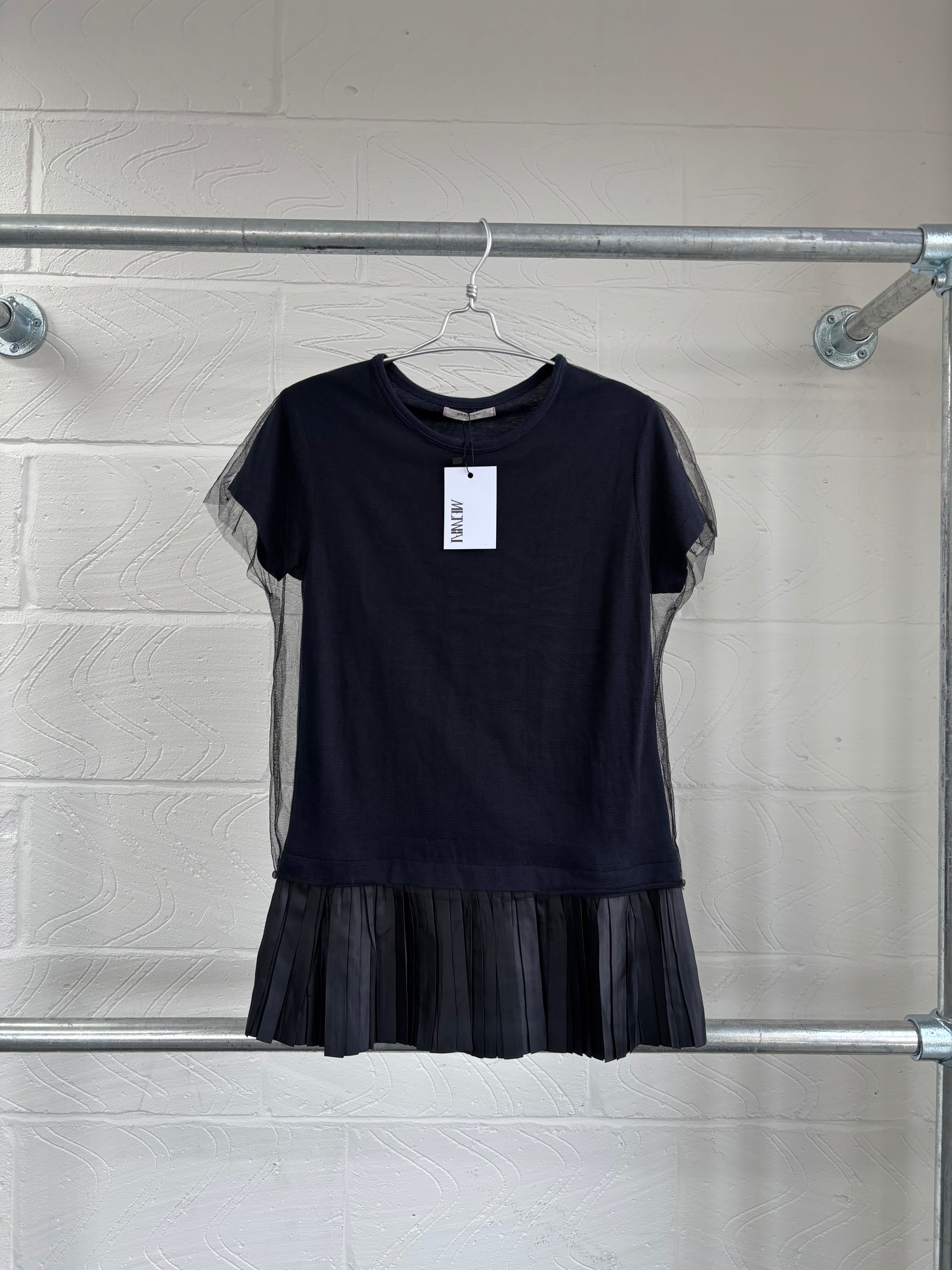 Japanese designer T-shirt with mesh overlay and pleated detailing.