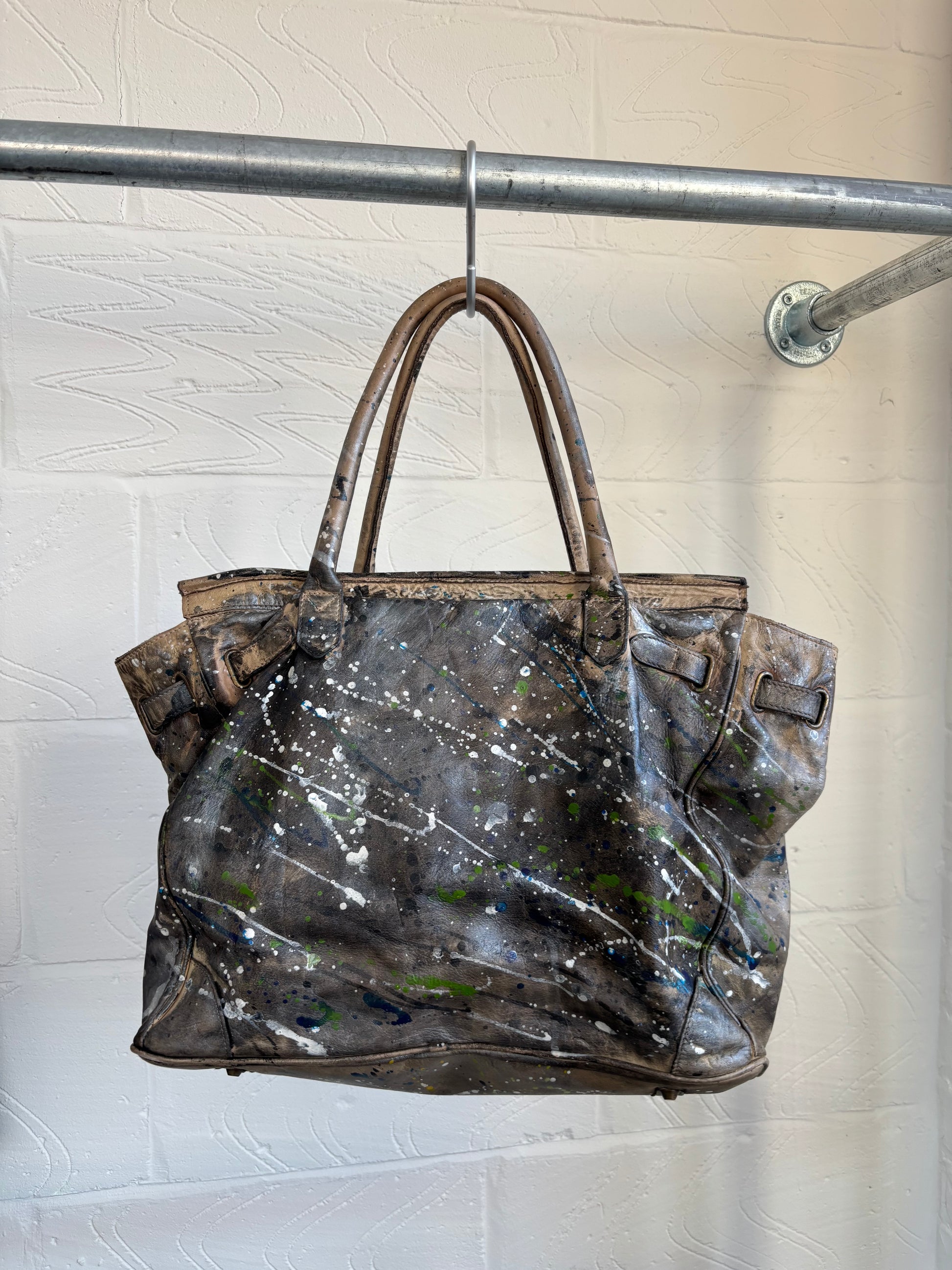 Paint splattered genuine leather firkin bag. Super unique.