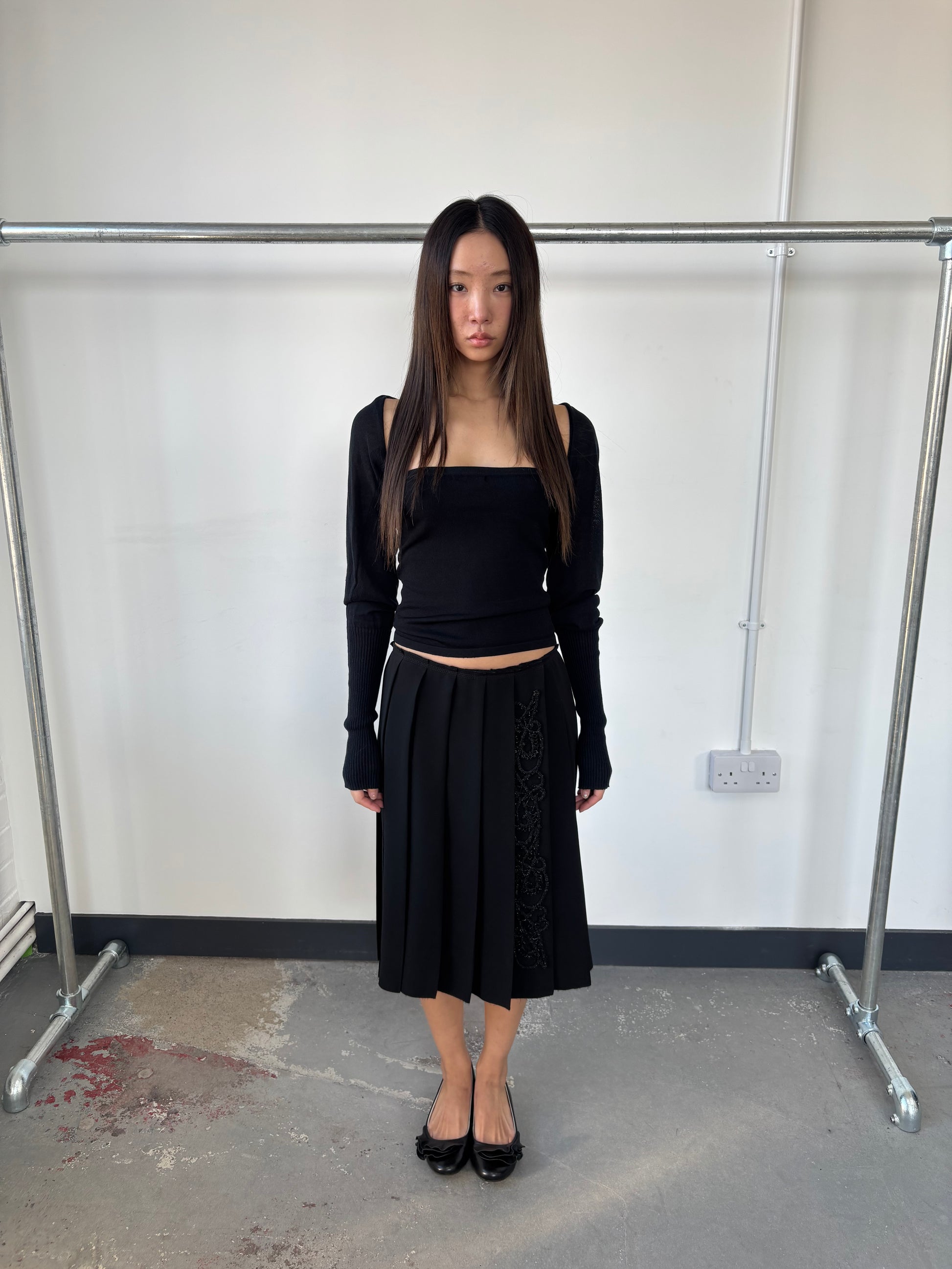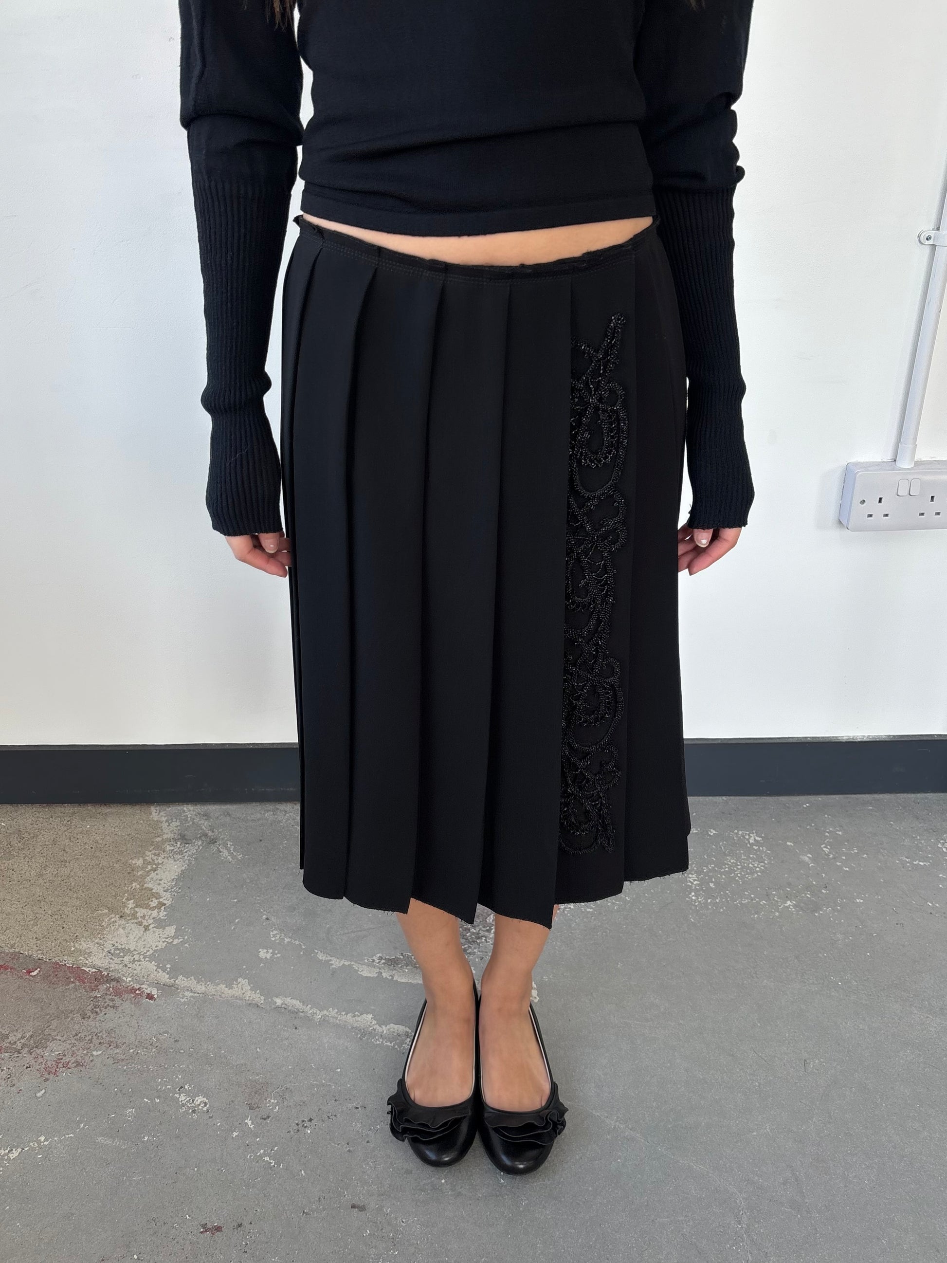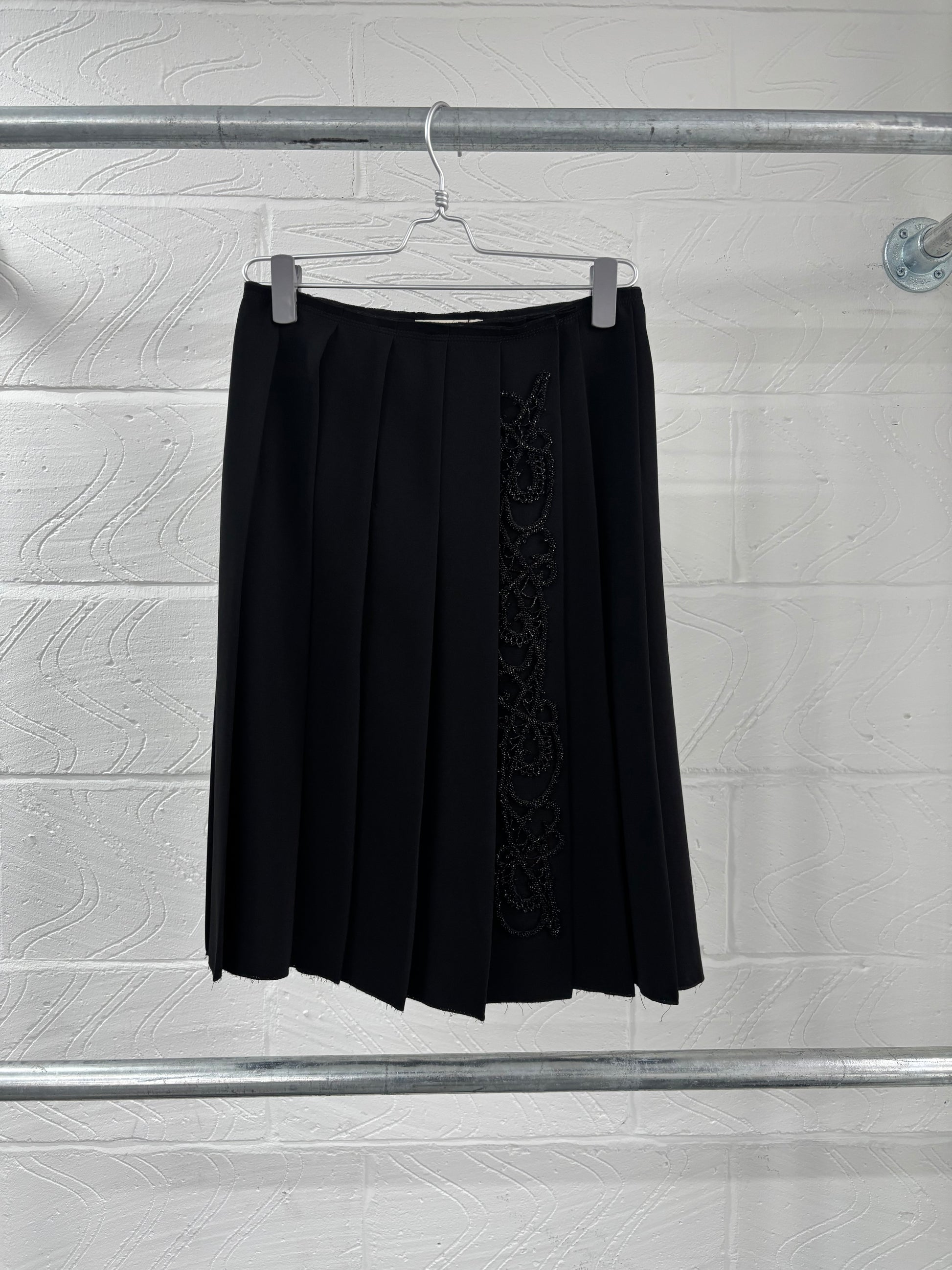 Pleated skirt with raw hem and embellished detailing by Prada.