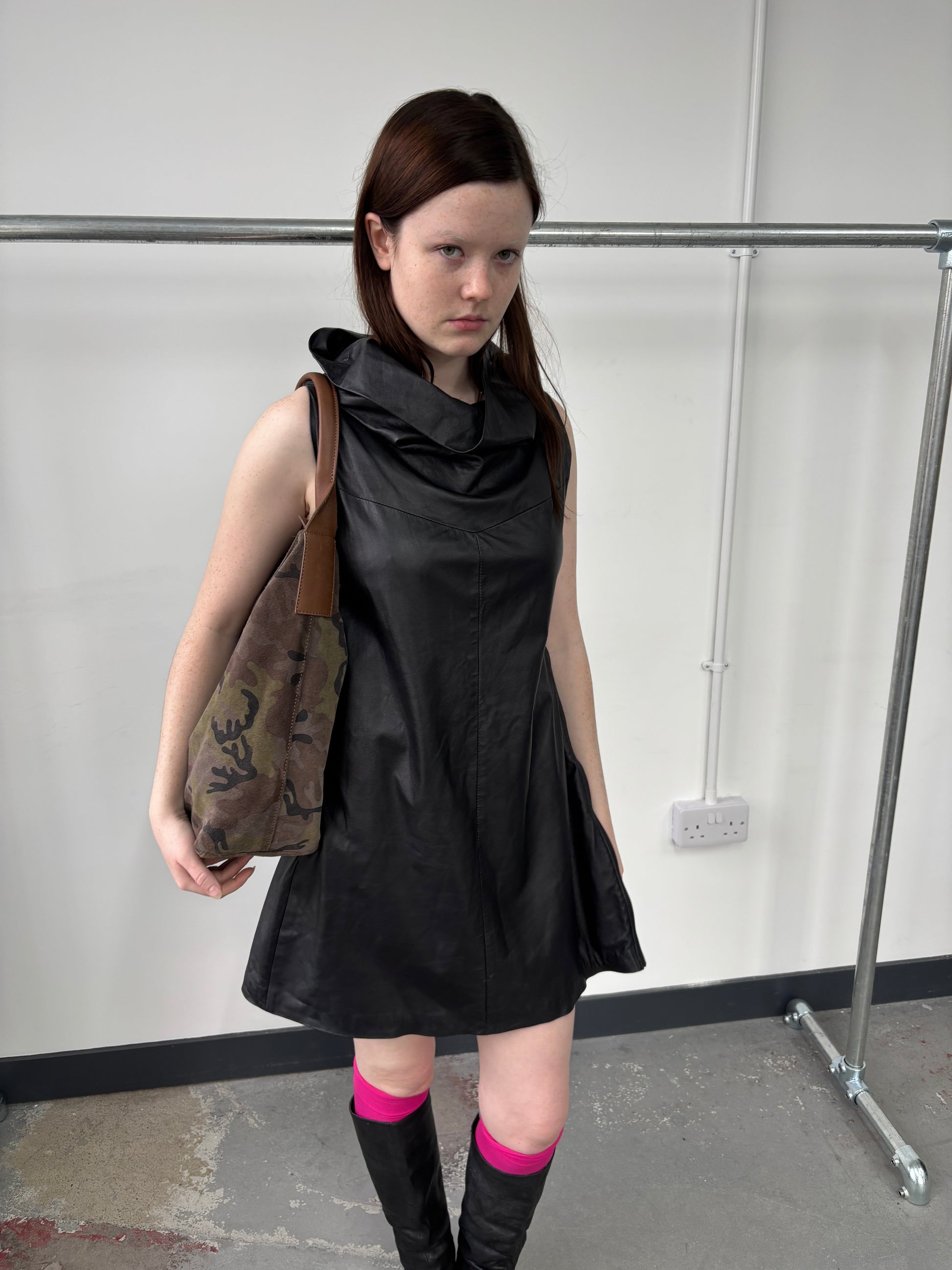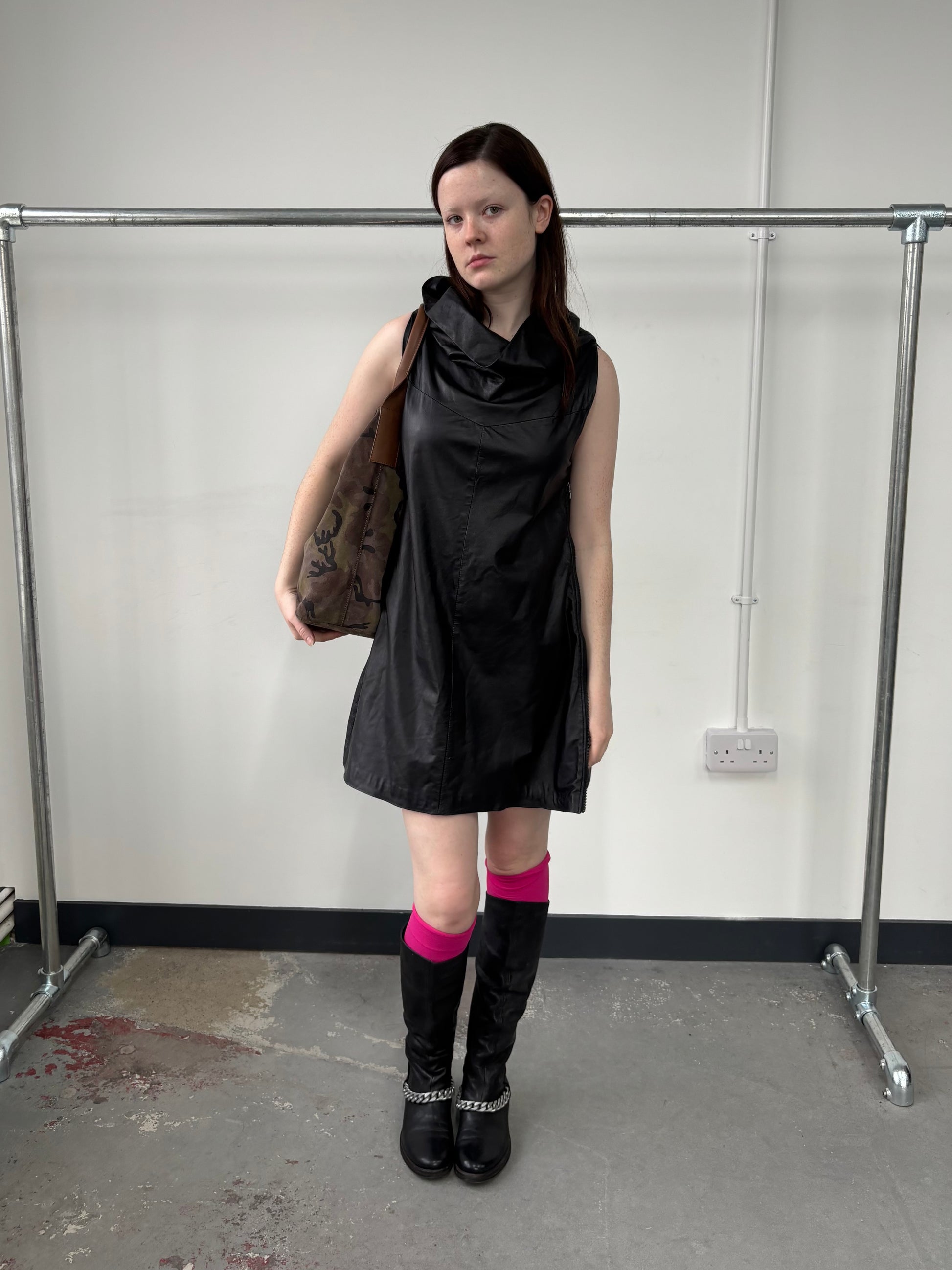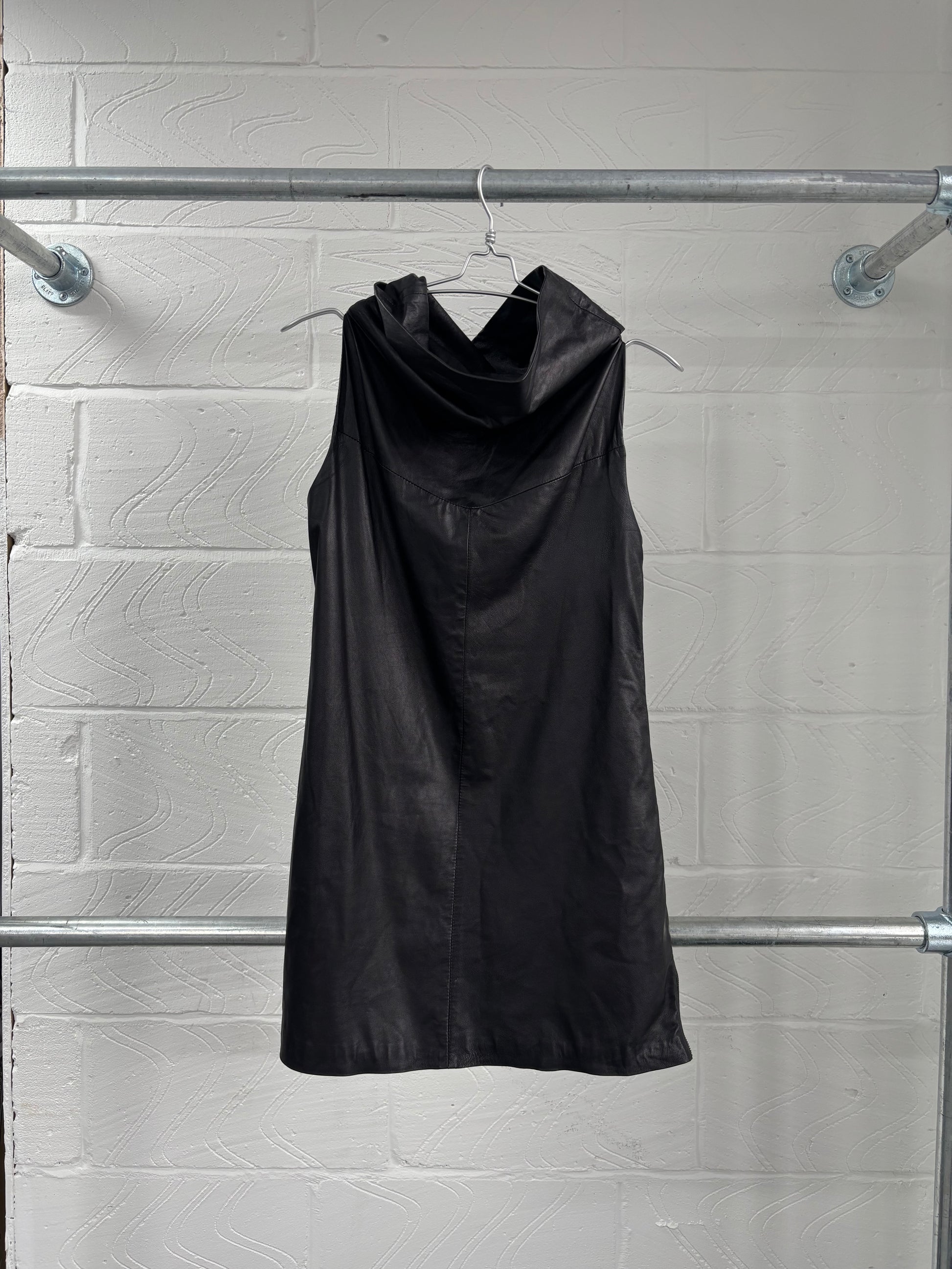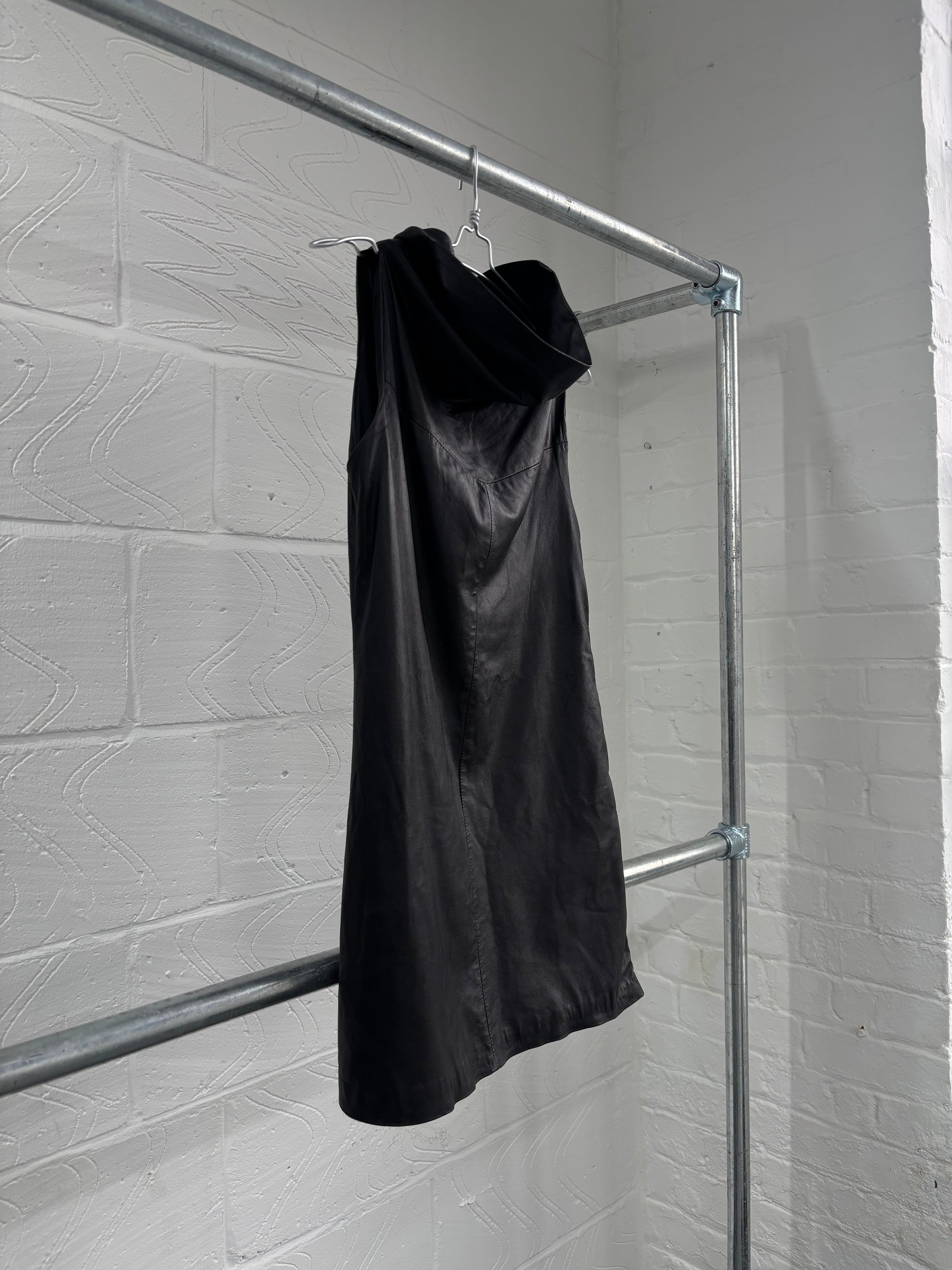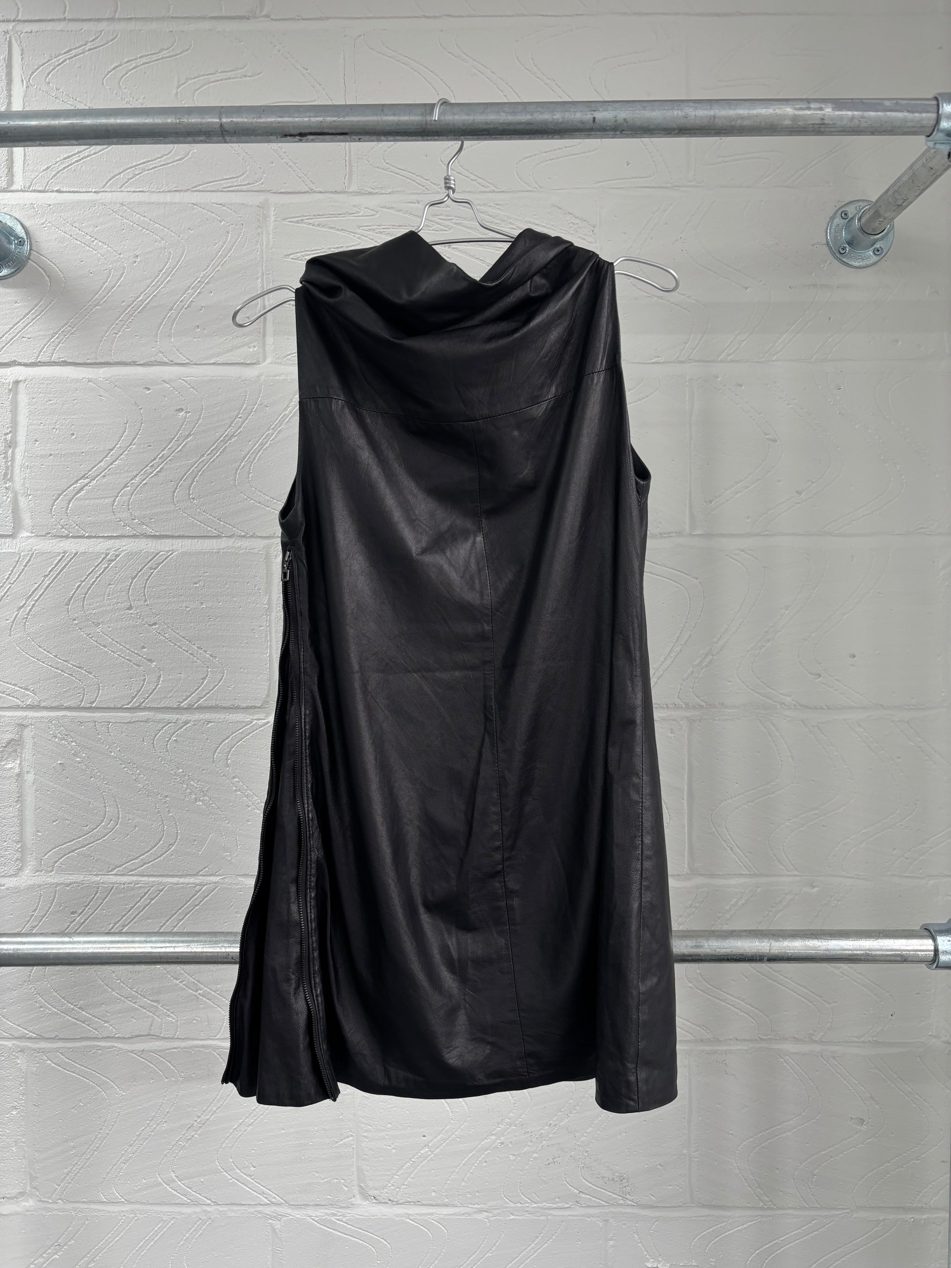 Leather high neck dress by Sarah Pacini. Zip detailing on side, drape neck.