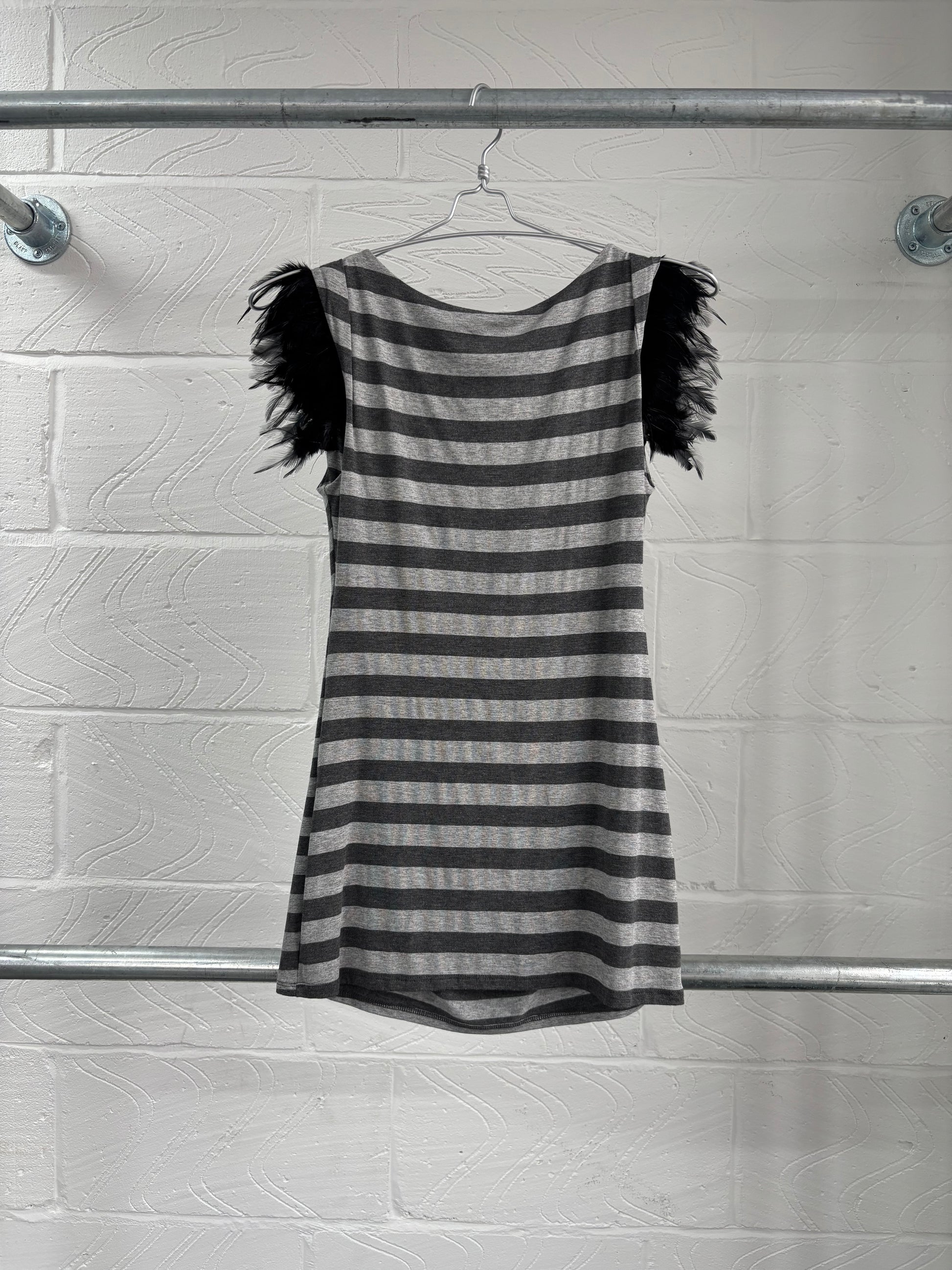 Stripe drape vest with feather detailing on shoulders. Made in Italy. Can be worn two ways.