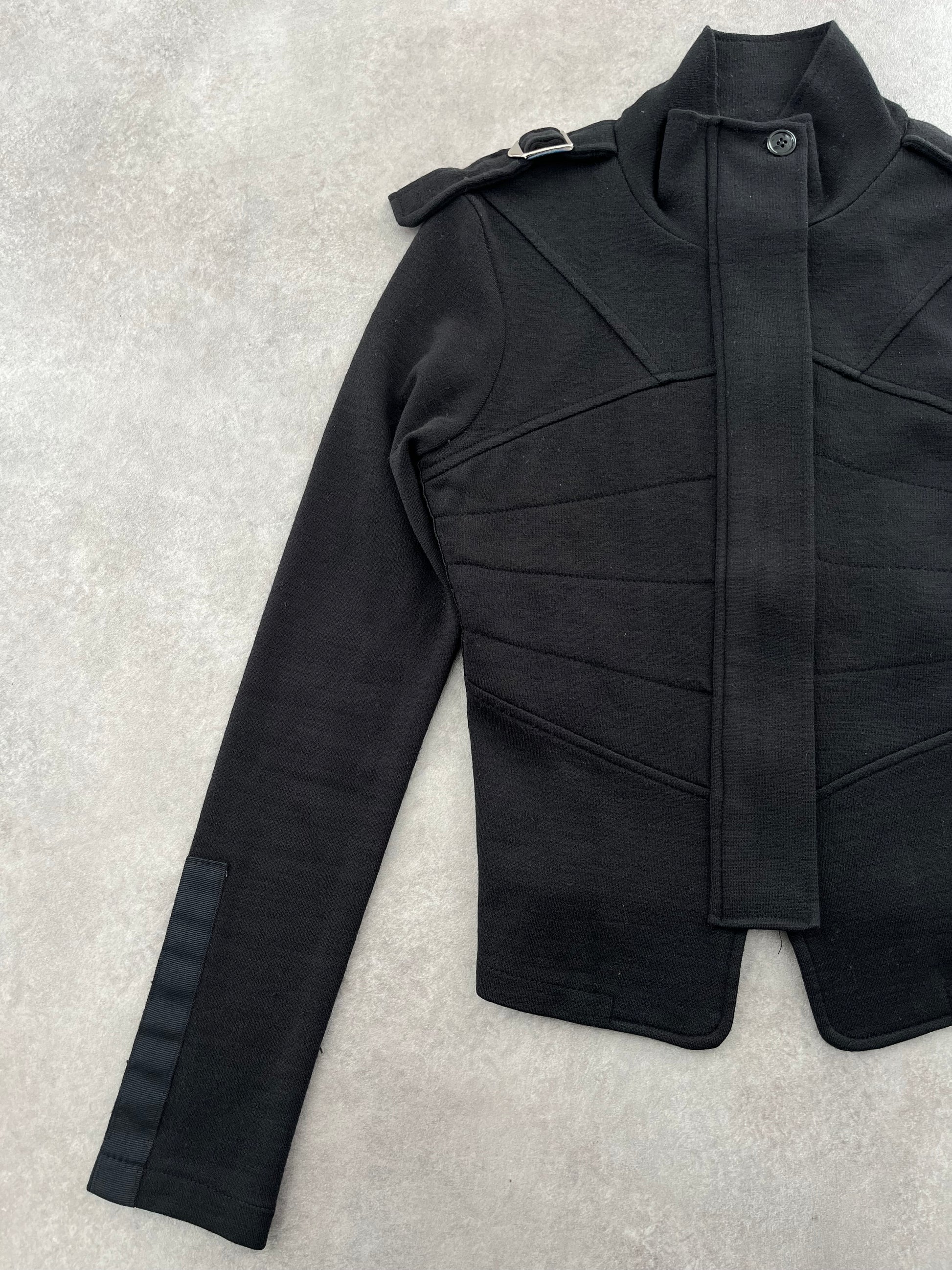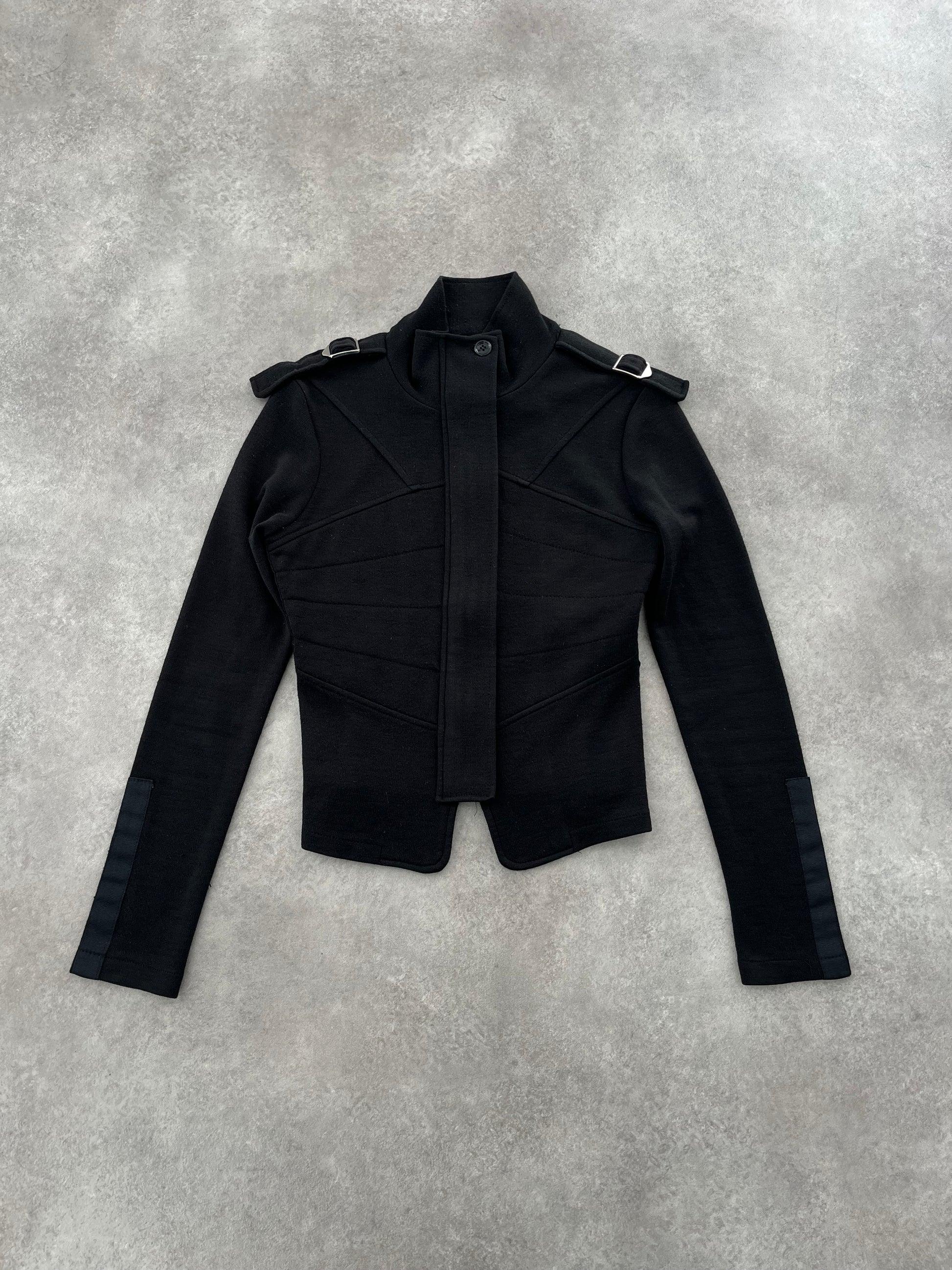 The most sculpting and fitting utility/military style knit jacket. Buckles on shoulders. Made from wool.